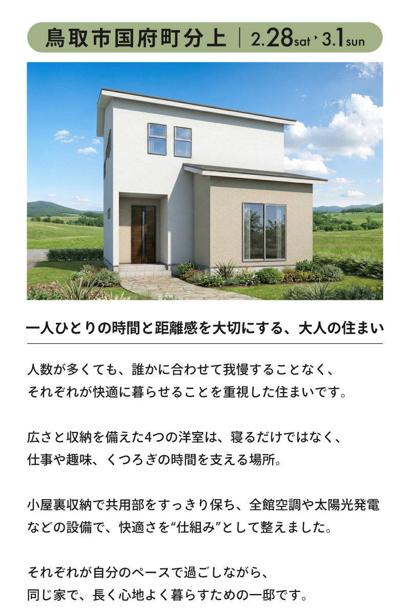 - 【鳥取市】暮らし方の違う2つの住まいを体感する 2週連続完成見学会